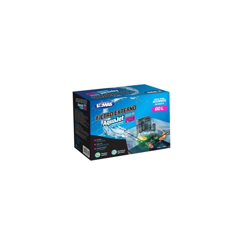Filtro Externo AquaJet Slim Pro 60 (60 litros) Adecuado para acuarios de agua dulce o marinos de 60 litros de capacidad Diseño delgado para fácil instalación Caída de agua que favorece la oxigenación del acuario Cartucho para una filtración mecánica y biológica Desnatador (skimmer) para atrapar desechos proteicos Válvula para controlar la entrada de flujo de agua Altura del tubo de entrada ajustable a distintos niveles de agua Funcionamiento: El filtro nunca debe operar en seco Una vez colocado y antes de conectarlo a la corriente eléctrica, es importante que se agregue un poco de agua dentro del filtro para que comience a trabajar correctamente Cuando el tanque del filtro esté lleno, el agua pasará por el cartucho filtrante para ser devuelta limpia al acuario El cartucho debe ser reempla